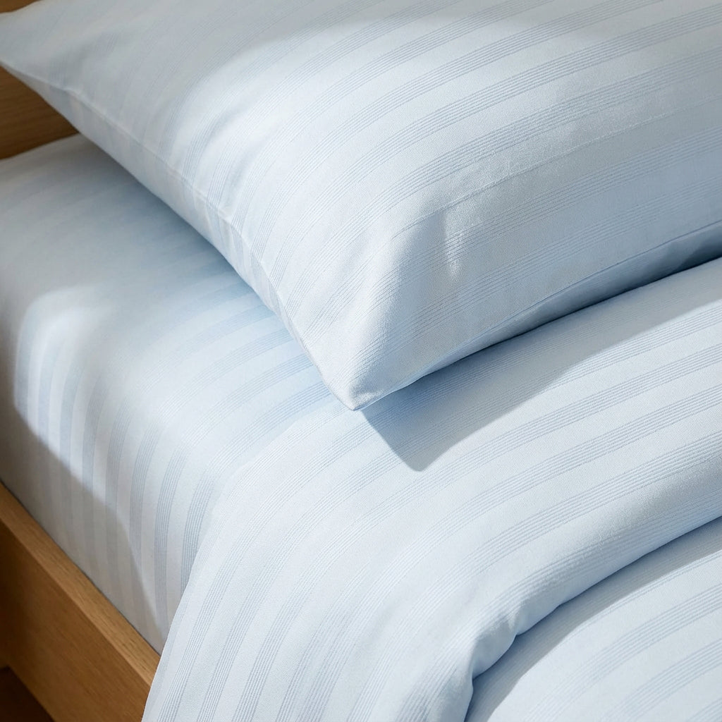 Soft, elegant and timeless — Sky Mist Luxe Stripe brings a hotel-style luxury feel to your bedroom with a smooth finish and subtle woven stripes.